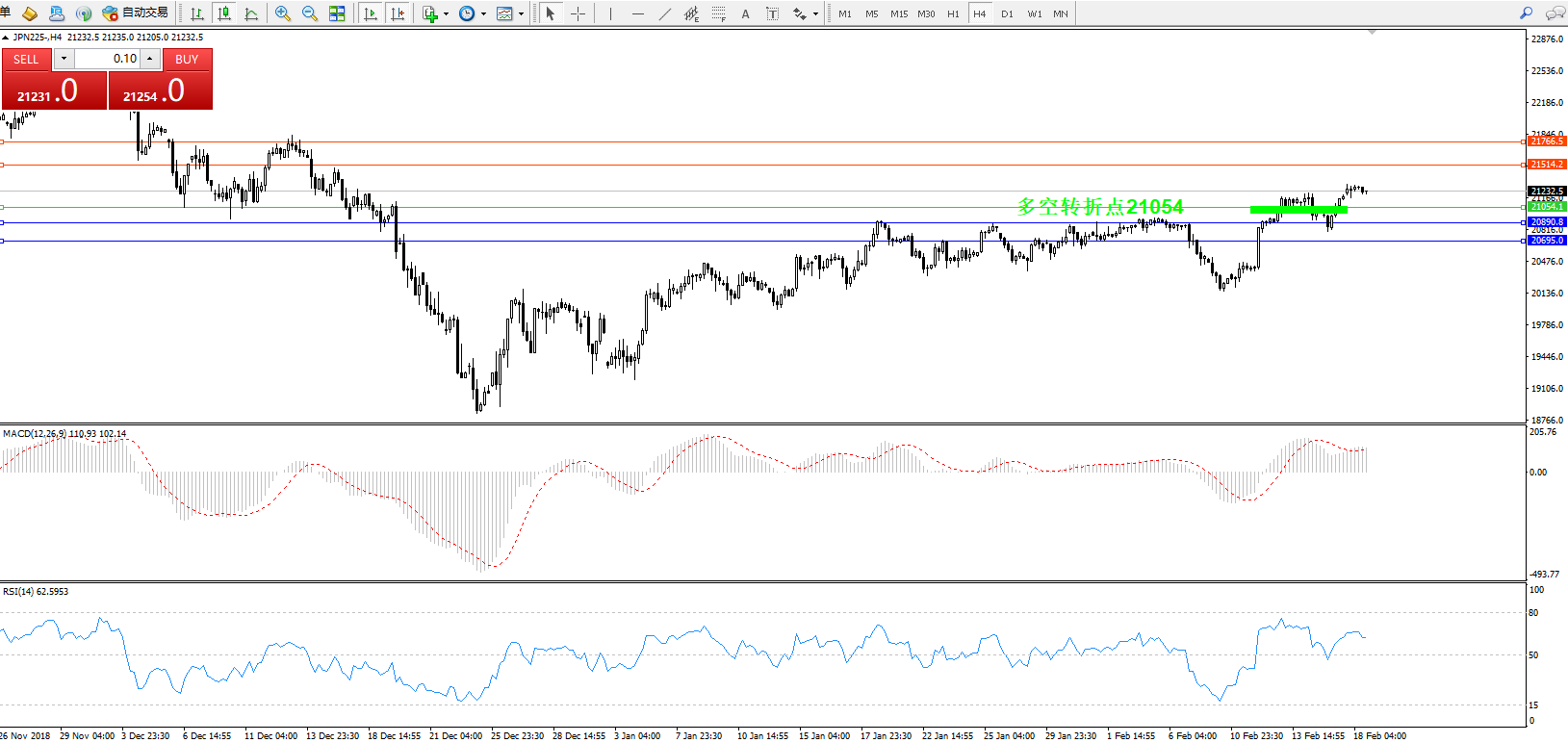 交易策略:21054上方看涨,目标21514、21766