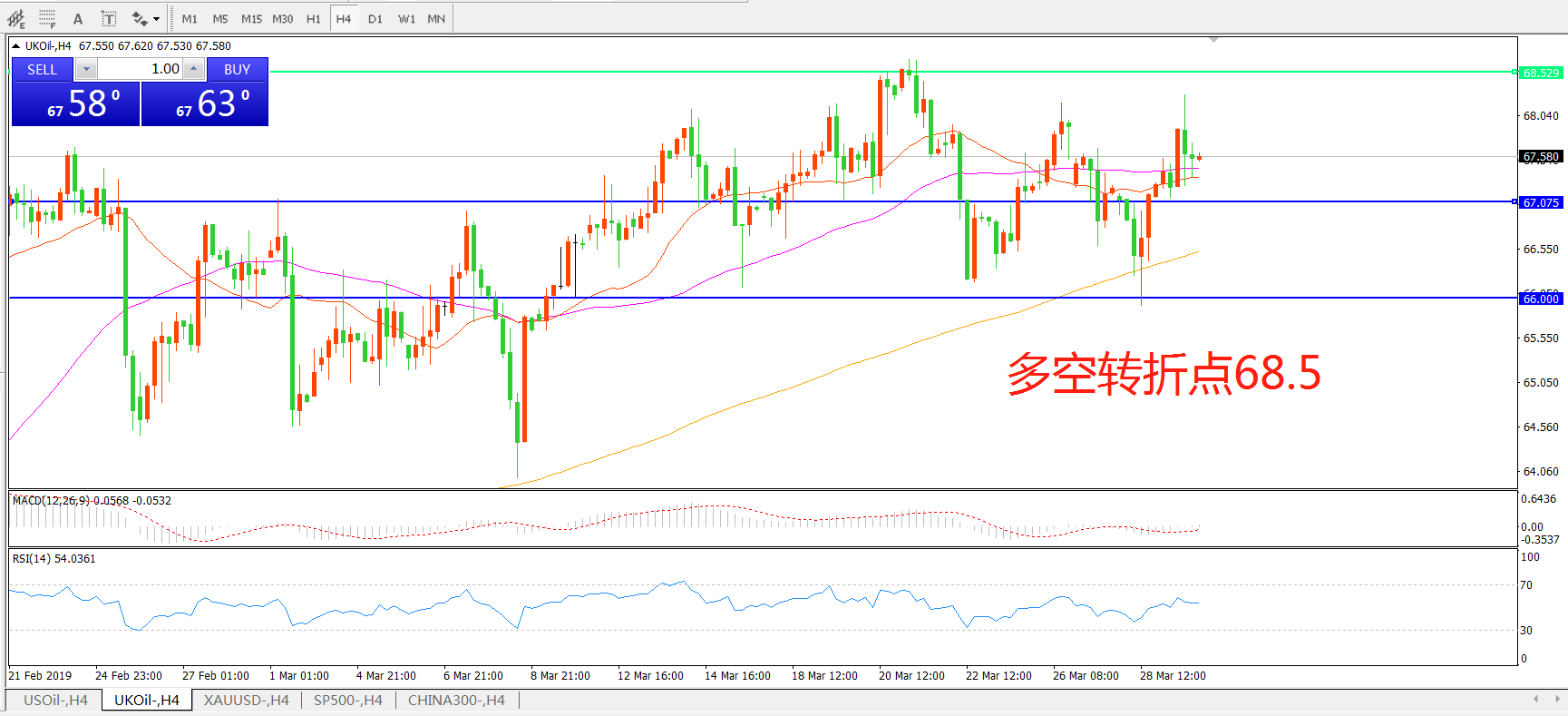 4小时图看,油价触碰200周期均线后震荡抬升,短期收稳于均线支撑之上,整体走势偏强,MACD红柱缩短,RSI指标拐头向上,日内重点关注上方68.5美元关口能否突破.