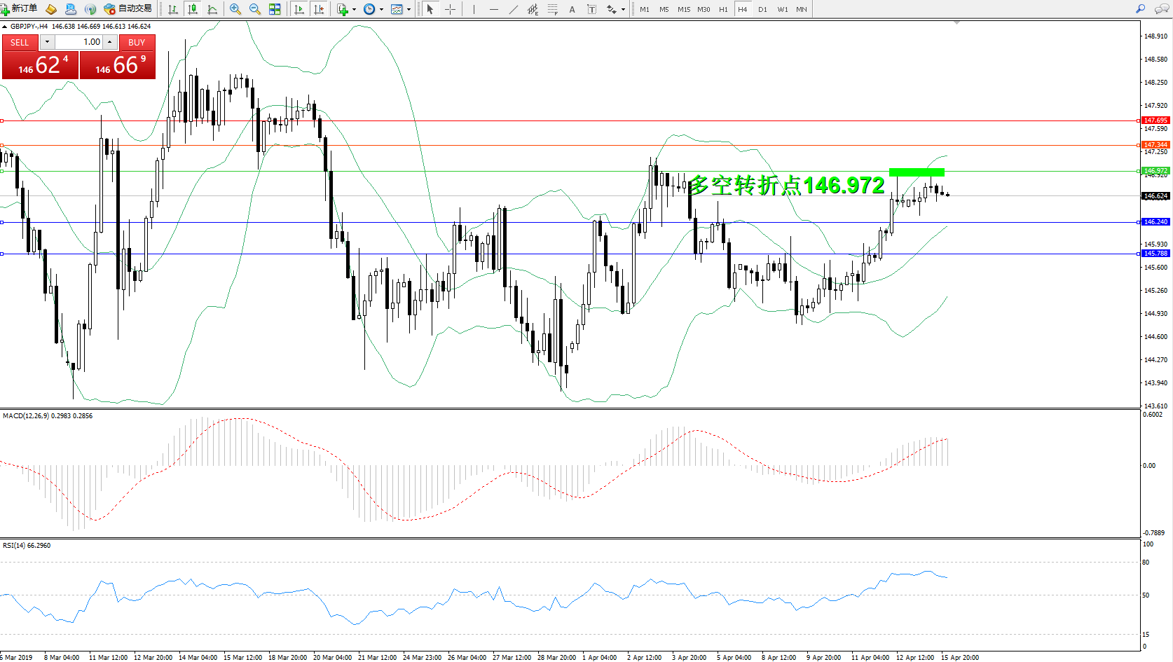 交易策略:146.972下方看跌,目标146.240、145.788