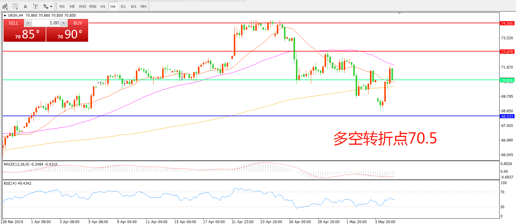 4小时图看,油价跳空低开后于美盘快速收复失地,并重新站上70.5一线,整体走势有所企稳,MACD绿柱减少, RSI指标向上,重点关注70.5一线能否企稳。