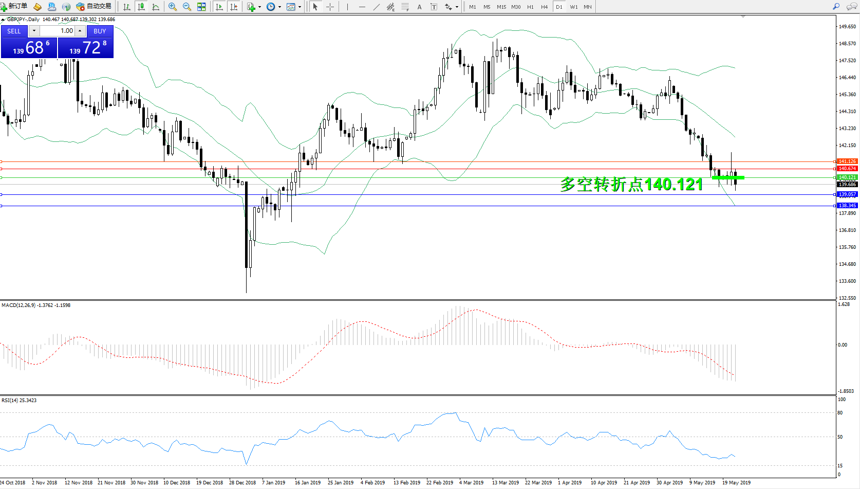 交易策略:140.121下方看跌,目标139.057138.345