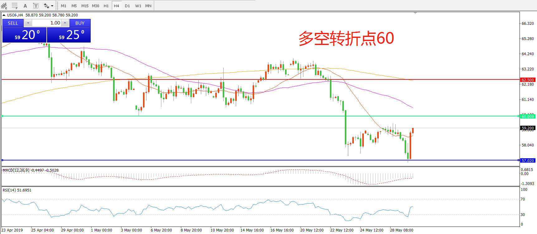 北京时间周四(5月30日)凌晨,美国石油协会(API)公布的数据显示,截至5月24日当周API原油库存超预期减少527万桶;但汽油库存意外增加271万桶,小幅利好。市场有消息称,负责石油供应中心库欣地区与伊利诺伊州伍德河炼油厂之间的原油运输管道,由于暴雨积洪影响在周二停止运营,此消息刺激美油隔夜在极度风险厌恶的市场情绪下竟强势反弹超2.5美元,最终收报59.2美元/桶但在关键技术阻力遇阻回落;另外中东利比亚战局可能影响该国95%的原油出口,需密切关注以上基本面消息进展,晚间EIA库存数据表现至关重要,将是美油短线是否继续受压60之下的关键数据,务必重点关注!