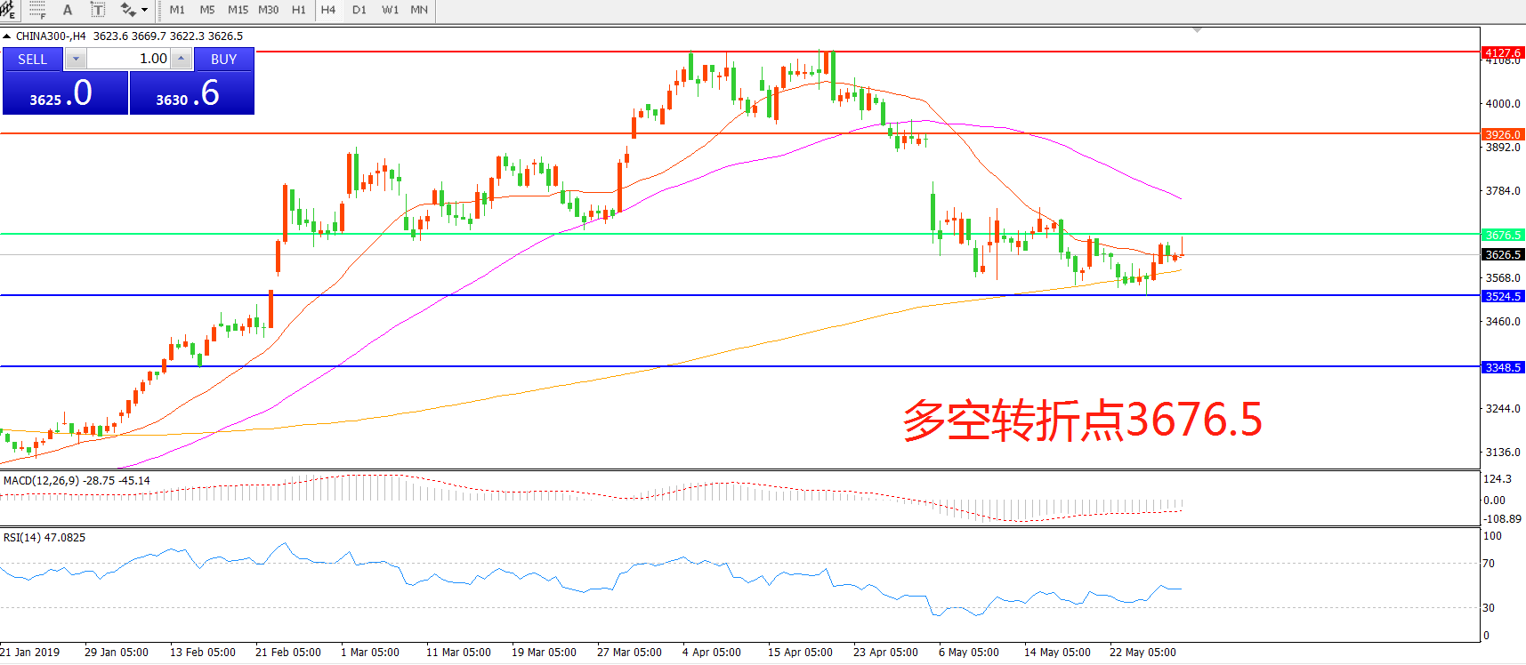 4小时图看,沪深300指数在跌破3676.5后陷入震荡走势,振幅逐渐收窄, 200均线成为短期支撑,MACD绿柱缩短,RSI指标走平,日内以震荡下行思路对待。