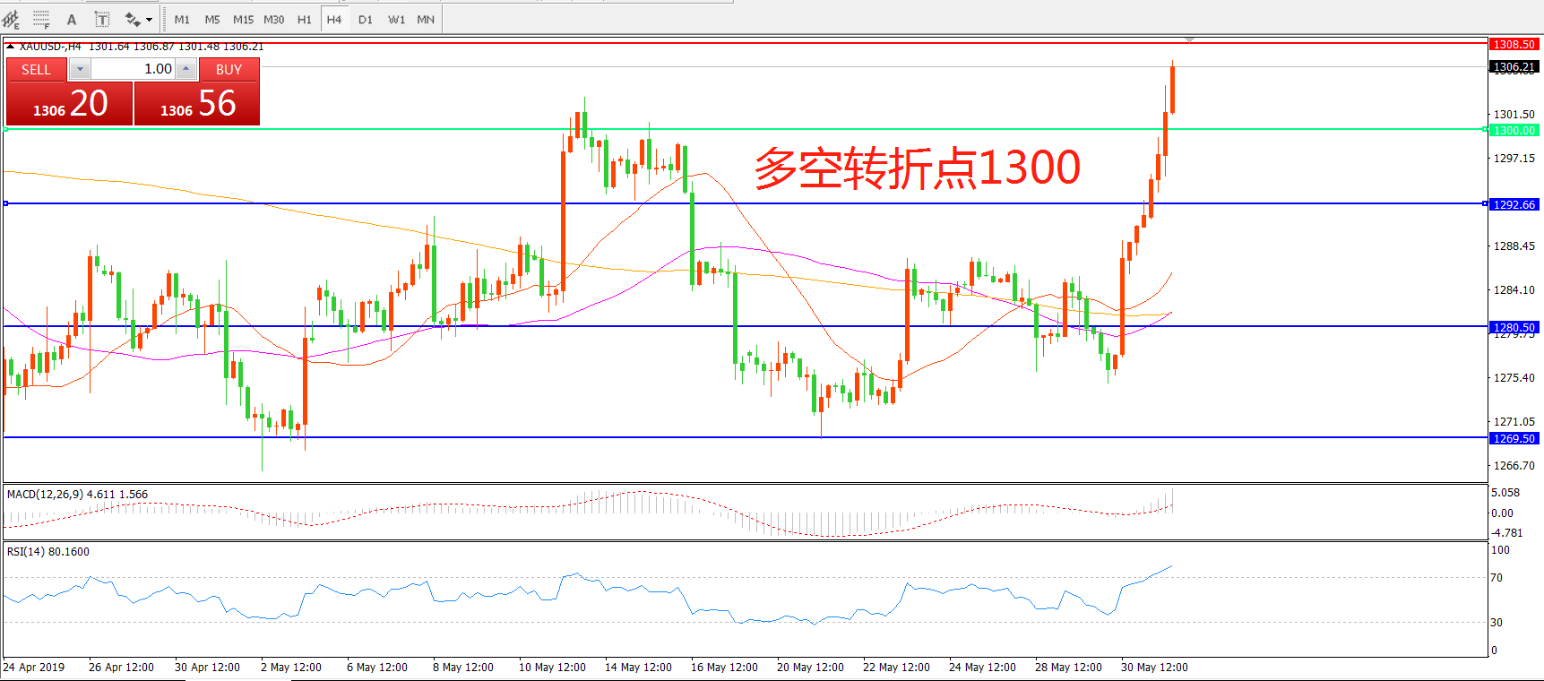 北京时间周五早上,美国总统特朗普宣布将对来自墨西哥的所有进口商品加征5%关税,关税将于6月10日生效,“直到非法移民不再经由墨西哥进入美国”。他警告说,关税“将逐步增加,直到非法移民问题得到纠正,关税就会被取消。中国周五宣布将建立“不可靠实体清单”制度,黄金周五大涨超15美元,冲破1300关口,周涨1.63%,月涨1.91%,创1月以来最大单月涨幅。