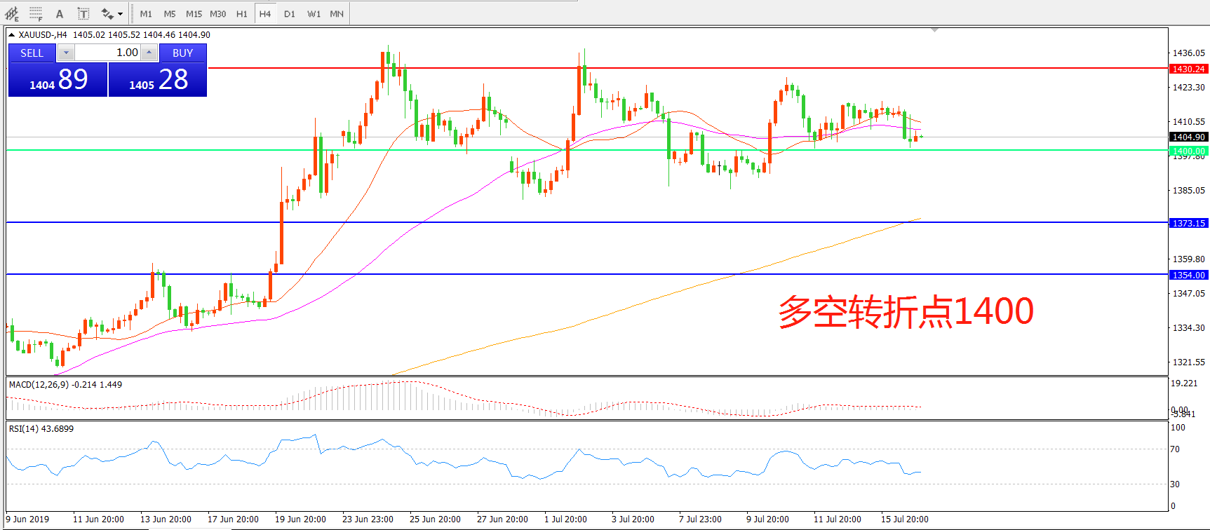 周二(7月16日)纽约时段盘中,金价震荡回落走低,超出预期的美国零售销售数据施压金价。不过,全球央行宽松预期仍然给予金价支撑,使得金价持稳于1400美元关口上方。而美联储主席鲍威尔周二在巴黎发表讲话时,详细阐述了美联储官员对贸易发展和全球经济增长的担忧,其导致经济前景的“不确定性”增加。此外,他还表示,人们对有关联邦债务上限、英国退欧的谈判以及通胀率低于美联储2%目标的“更长期的缺口”感到担忧。鲍威尔话音刚落,美元指数短线小幅下挫至97.28,但随后很快转而上扬,并刷新日高至97.40,现货黄金则呈现冲高回落走势,最终收报1404.76美元/盎司。