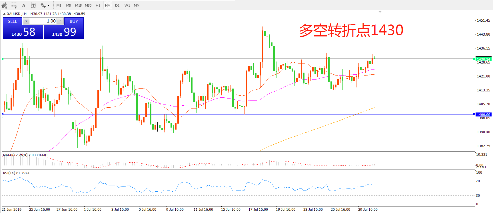 本周有足够多的重磅事件引爆行情,包括周四02:00即将公布的美联储利率决定,正在进行中的中美贸易谈判,周五将发布的美国非农数据等。今晚20:15将公布俗称小非农的ADP就业人数,市场常作为周五非农数据的前瞻;如果美联储降息幅度不及预期,而非农数据又十分强劲,黄金将会承压,反之,若美联储在周四02:30新闻发布会中鸽派态度超预期,非农不够强劲的话,黄金将会受到进一步提振。总之在催化剂触发之前,黄金将保持宽幅震荡。现货黄金周二(7月30日)保持小幅上涨,最终收报1430.90美元/盎司。日内保持向上强势整理蓄势试图突破1433阻力位,市场对美联储的降息预期在价格上已经表露无疑。