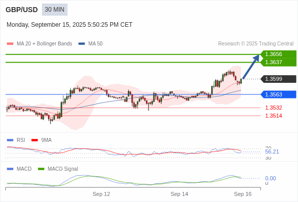 交易策略: 看涨,当 1.3563 为支撑位,目标定在1.3656。