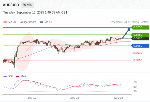 在 0.6650 之上,看涨,目标价位为 0.6680 ,然后为 0.6700 。