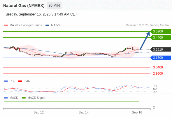 Natural Gas (NYMEX) (NOV5) 当日内: 看涨,当 3.1700 为支撑位,目标定在3.5200。