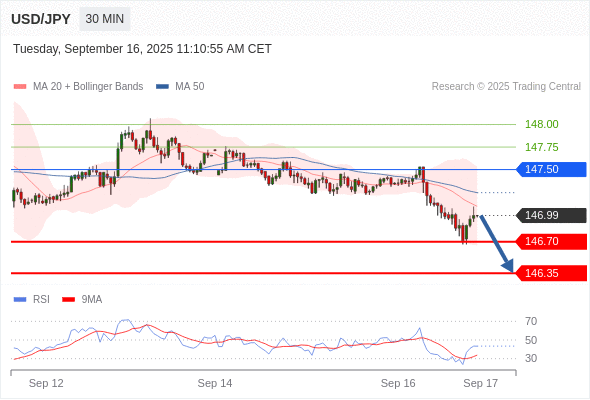 在 147.50 之下,看跌,目标价位为 146.70 ,然后为 146.35 。