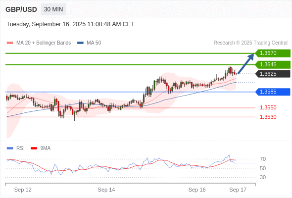 在 1.3585 之上,看涨,目标价位为 1.3645 ,然后为 1.3670 。