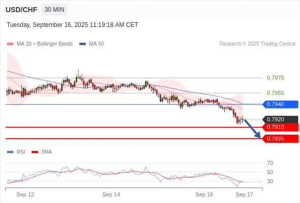 在 0.7940 之下,看跌,目标价位为 0.7910 ,然后为 0.7895 。