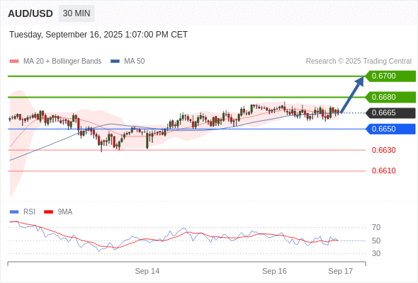 在 0.6650 之上,看涨,目标价位为 0.6680 ,然后为 0.6700 。