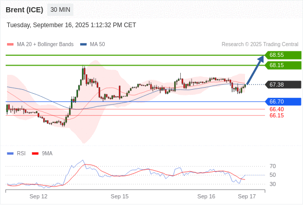 在 66.70 之上,看涨,目标价位为 68.15 ,然后为 68.55 。
