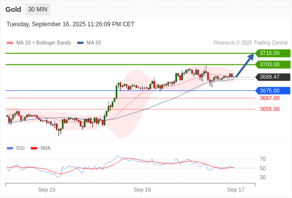 在 3675.00 之上,看涨,目标价位为 3703.00 ,然后为 3715.00 。