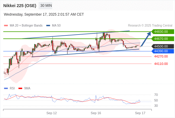 在 44390.00 之上,看涨,目标价位为 44670.00 ,然后为 44830.00 。