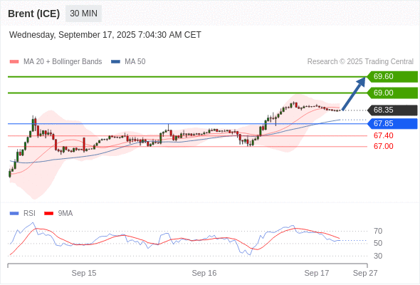 在 67.85 之上,看涨,目标价位为 69.00 ,然后为 69.60 。