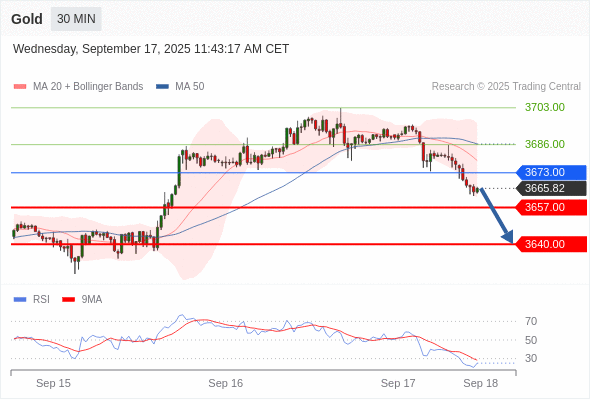 在 3673.00 之下,看跌,目标价位为 3657.00 ,然后为 3640.00 。