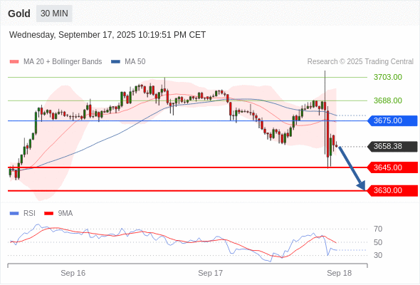 在 3675.00 之下,看跌,目标价位为 3645.00 ,然后为 3630.00 。
