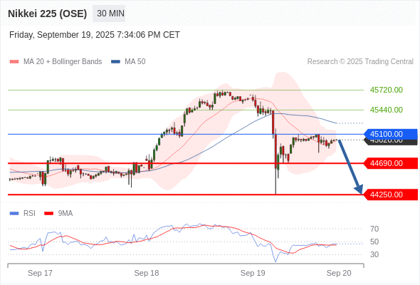 日经225股指期货 (OSE) 当日内: 短期关键阻力位在45100.00。