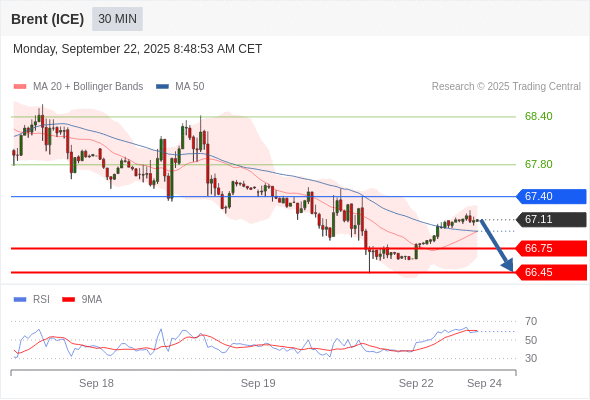 在 67.40 之下,看跌,目标价位为 66.75 ,然后为 66.45 。