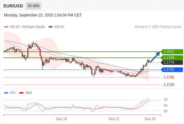 在 1.1750 之上,看涨,目标价位为 1.1790 ,然后为 1.1810 。