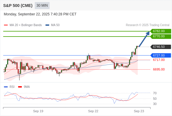 美国标普500指数期货 (Z5) 当日内: 超短线(当日内)支撑位在6727.00附近。