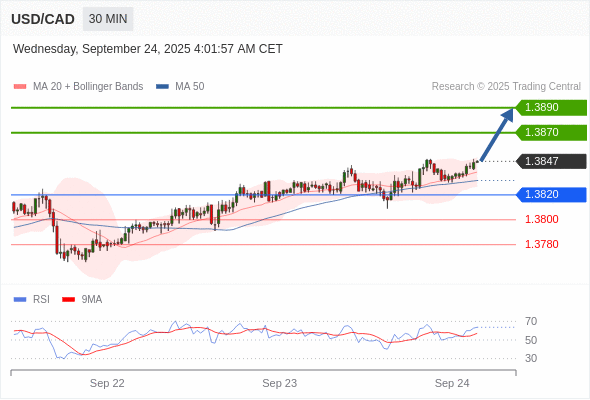 在 1.3820 之上,看涨,目标价位为 1.3870 ,然后为 1.3890 。