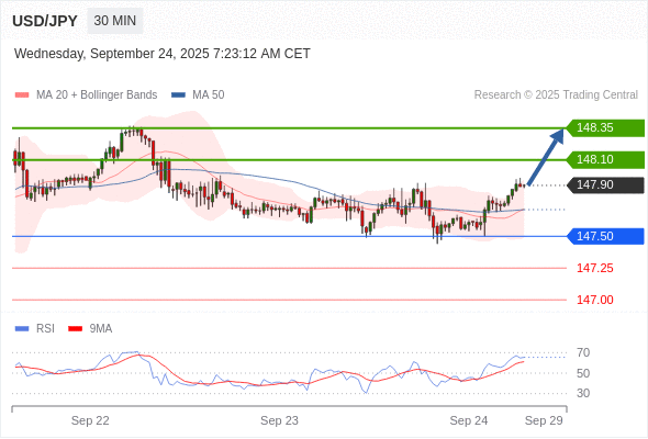 在 147.50 之上,看涨,目标价位为 148.10 ,然后为 148.35 。