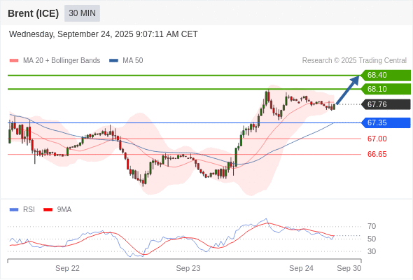 在 67.35 之上,看涨,目标价位为 68.10 ,然后为 68.40 。