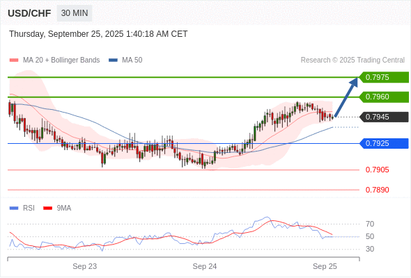 美元/瑞郎 当日内: 在0.7925之上,看涨。