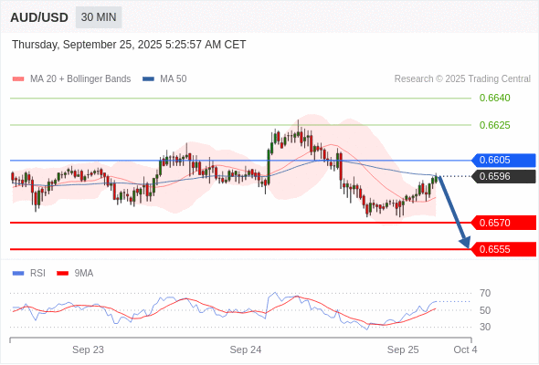在 0.6605 之下,看跌,目标价位为 0.6570 ,然后为 0.6555 。