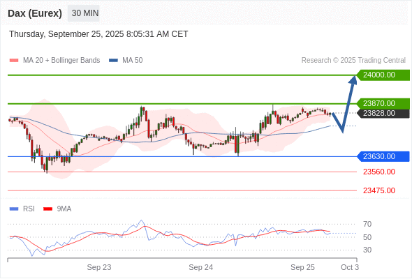 德国DAX指数期货 (Eurex) (Z5) 当日内: 在23630.00之上,看涨。