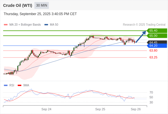 在 64.20 之上,看涨,目标价位为 65.00 ,然后为 65.40 。