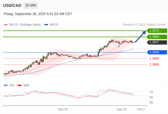 在 1.3905 之上,看涨,目标价位为 1.3955 ,然后为 1.3975 。