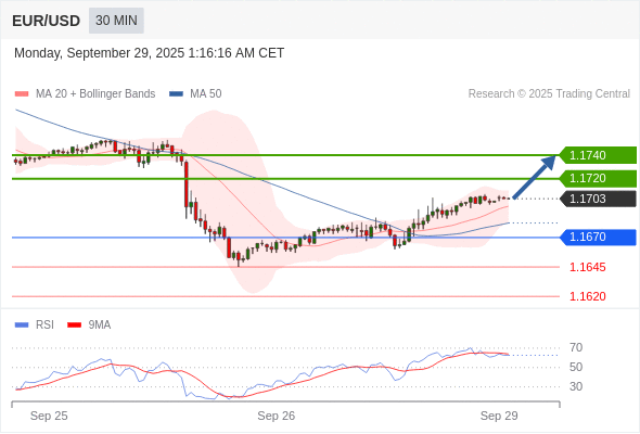 在 1.1670 之上,看涨,目标价位为 1.1720 ,然后为 1.1740 。