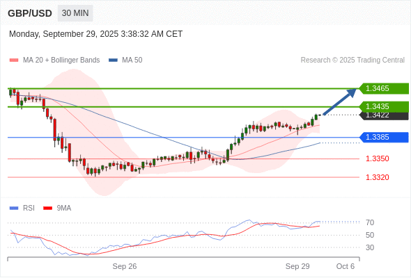 在 1.3385 之上,看涨,目标价位为 1.3435 ,然后为 1.3465 。
