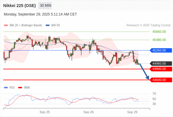 在 45250.00 之下,看跌,目标价位为 44840.00 ,然后为 44600.00 。