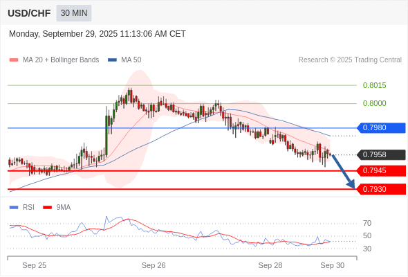 在 0.7980 之下,看跌,目标价位为 0.7945 ,然后为 0.7930 。