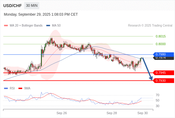 在 0.7980 之下,看跌,目标价位为 0.7945 ,然后为 0.7930 。
