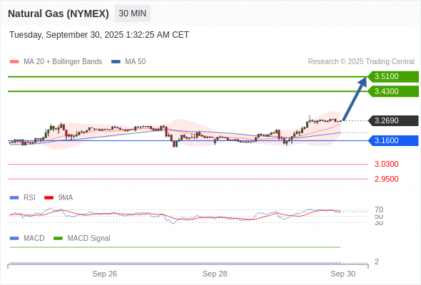备选策略: 如跌破 3.1600 ,Natural Gas (NYMEX) (NOV5) 目标方向定在 3.0300 和 2.9500 。