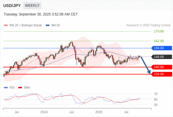 交易策略: 在 156.00 之下,看跌,目标价位为 140.00 ,然后为 134.00 。