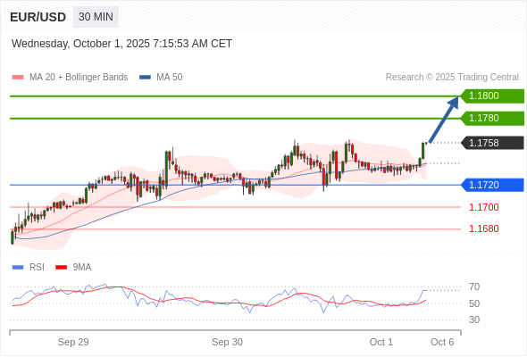 在 1.1720 之上,看涨,目标价位为 1.1780 ,然后为 1.1800 。