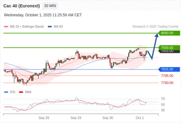 法国CAC指数期货 (Euronext) (V5) 当日内: 在7825.00之上,看涨。