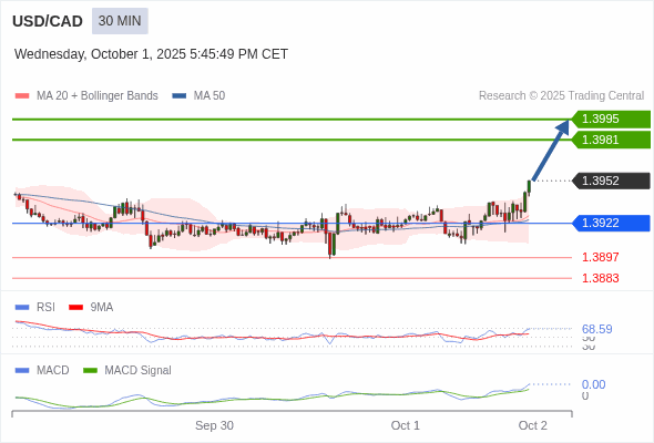 美元/加元 当日内 : 看涨,当 1.3922 为支撑位。