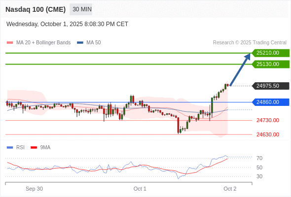 在 24860.00 之上,看涨,目标价位为 25130.00 ,然后为 25210.00 。