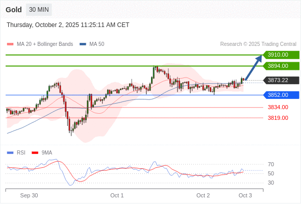 交易策略: 在 3852.00 之上,看涨,目标价位为 3894.00 ,然后为 3910.00 。