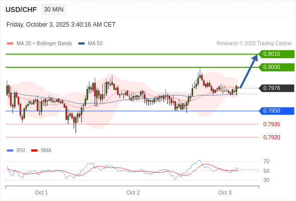 美元/瑞郎 当日内: 在0.7950之上,看涨。