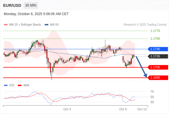 在 1.1740 之下,看跌,目标价位为 1.1705 ,然后为 1.1685 。