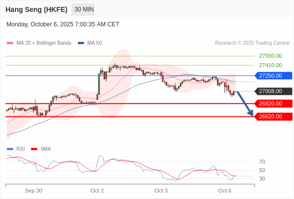 在 27250.00 之下,看跌,目标价位为 26820.00 ,然后为 26620.00 。